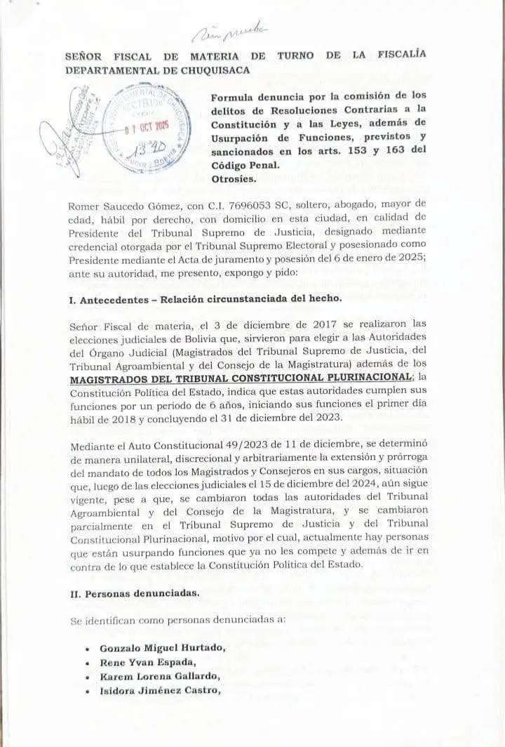 El presidente del Tribunal Supremo de Justicia (TSJ), Romer Saucedo Gómez, presentó formalmente una denuncia penal ante la Fiscalía Departamental de Chuquisaca contra los magistrados del Tribunal Constitucional Plurinacional (TCP) por la presunta comisión de los delitos de ‘Resoluciones Contrarias a la Constitución y a las Leyes’ y ‘Usurpación de Funciones’, tipificados en los artículos 153 y 163 del Código Penal.
