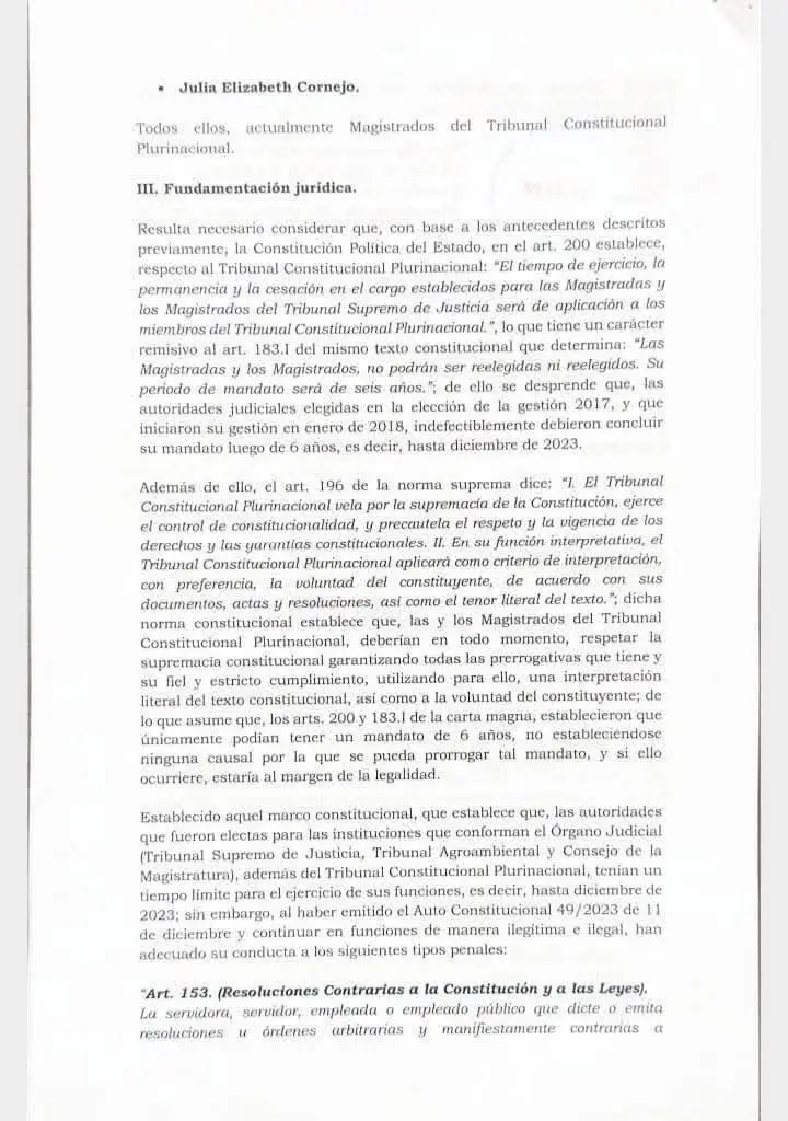 En el documento presentado al Fiscal de Materia de Turno, Saucedo argumenta que los magistrados del TCP extendieron arbitrariamente su mandato, pese a que la Constitución Política del Estado (CPE) establece un periodo de seis años para las altas autoridades judiciales elegidas por voto popular en 2017, cuyo mandato concluyó el 31 de diciembre de 2023.