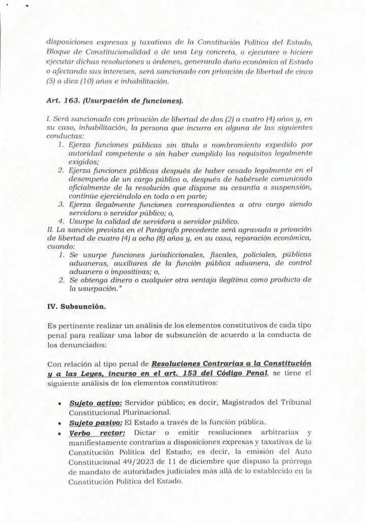 La denuncia detalla que los actos de los magistrados denunciados podrían configurar los delitos de: Resoluciones Contrarias a la Constitución y a las Leyes (Art. 153 C.P.), que sanciona a servidores públicos que dicten resoluciones arbitrarias o manifiestamente contrarias a la Carta Magna.