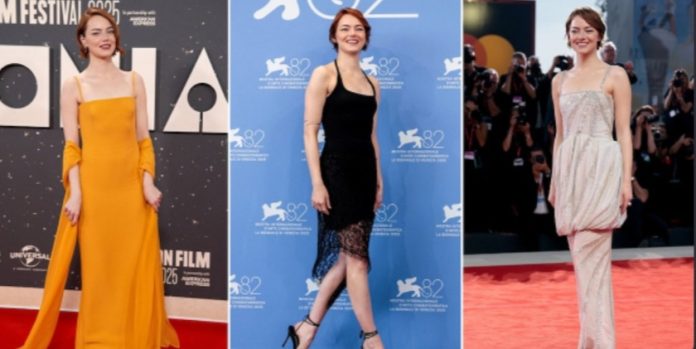 Stone apostó recientemente, para la premiere de “Bugonia” en el Festival de Cine de Londres 2025, por un vestido largo de tirantes finos en color naranja intenso, una elección que atrajo las miradas por la vibración cromática y la pureza de líneas. El escote recto define una silueta depurada, mientras que la caída fluida de la falda aporta movimiento y ligereza.