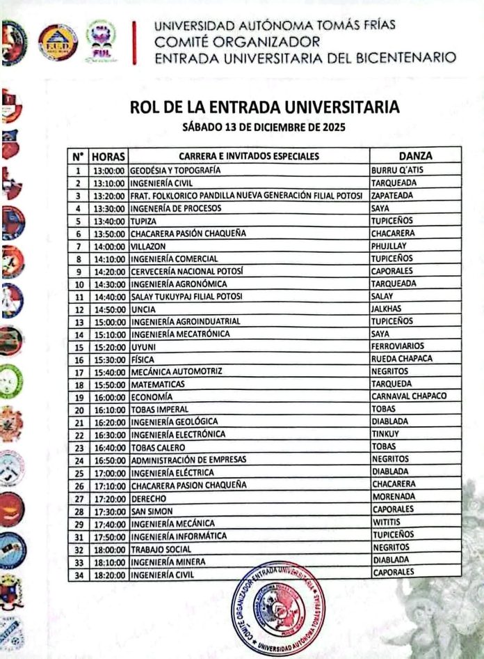 Se confirma la participación de más de 34 fraternidades de la comunidad universitaria, las sedes dispersas e invitados de la ciudad de Potosí.