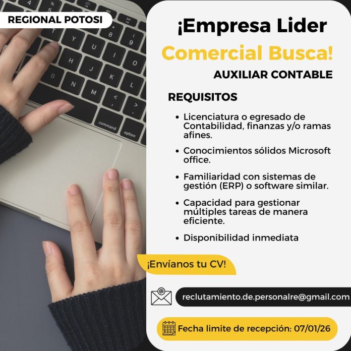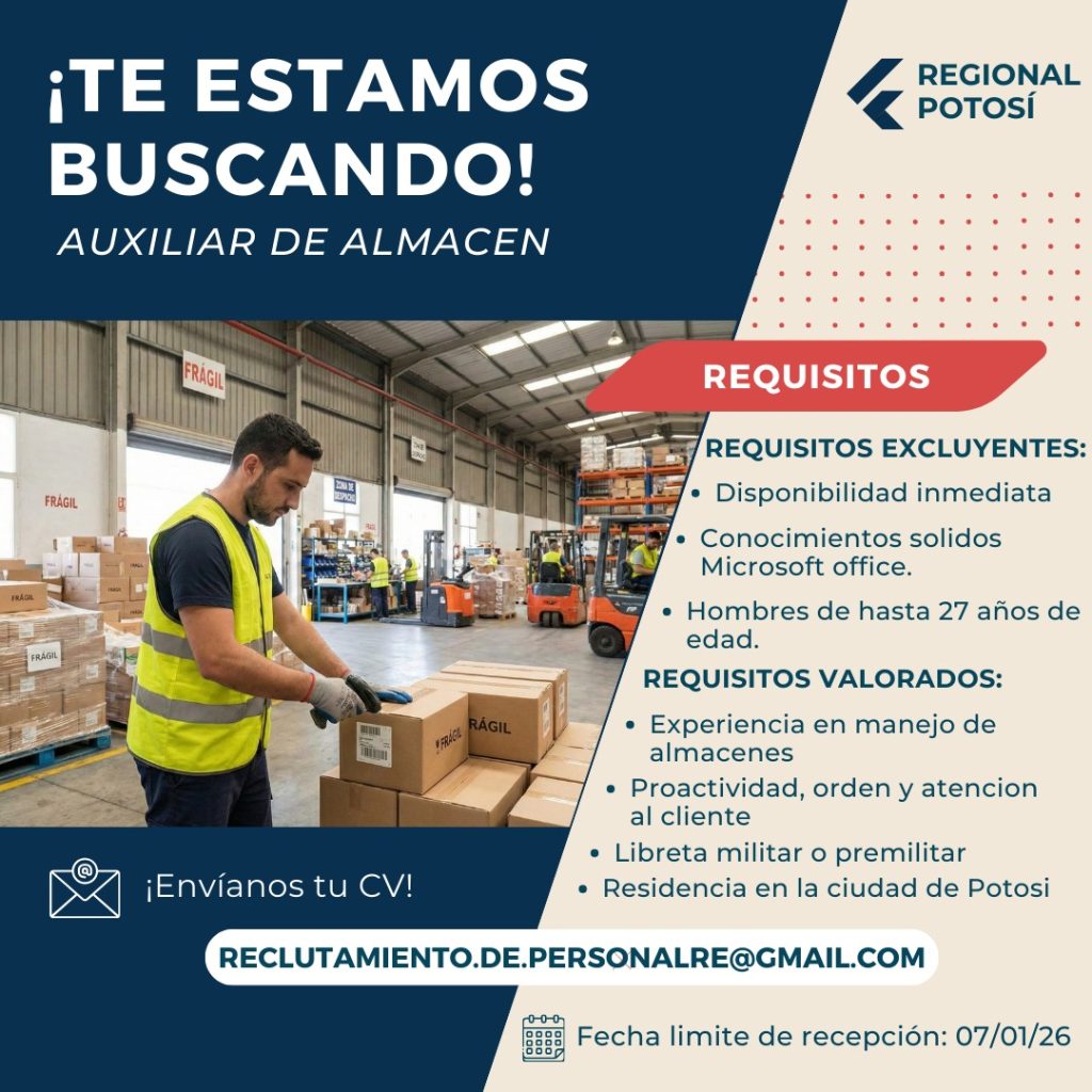 InicioRadio CambalacheREQUERIMIENTO DE PERSONAL:... REQUERIMIENTO DE PERSONAL: AUXILIAR DE ALMACEN Y AUXILIAR CONTABLE Por Equipo de Edición 2 enero, 2026 - 12:52 FacebookWhatsAppTwitter Últimas Noticias Fiscalía investiga a 5 policías de Oruro por concusión... Nacional Aprehenden a Franklin Flores, exgerente de Emapa que incumplió orden judicial Internacional 10 desafíos políticos y económicos que determinarán el futuro de América Latina en 2026 Cultura y Espectáculos La hija del actor Tommy Lee Jones, de 34 años, es encontrada muerta en un hotel el día de Año Nuevo ¿Sabía usted? “El alcohol nos hace decir lo que de otro modo no diríamos”: cómo superar el arrepentimiento por verborrea etílica Continua leyendo Radio CambalacheREQUERIMIENTO DE PERSONAL: ASISTENTE DE RECTORADO Radio CambalacheREQUERIMIENTO DE PERSONAL: AUXILIAR CONTABLE Y AUXILIAR DE ALMACEN Radio CambalacheAsociación de Comerciantes “29 de Agosto” invita a la Gran Feria de Navidad y Año Nuevo