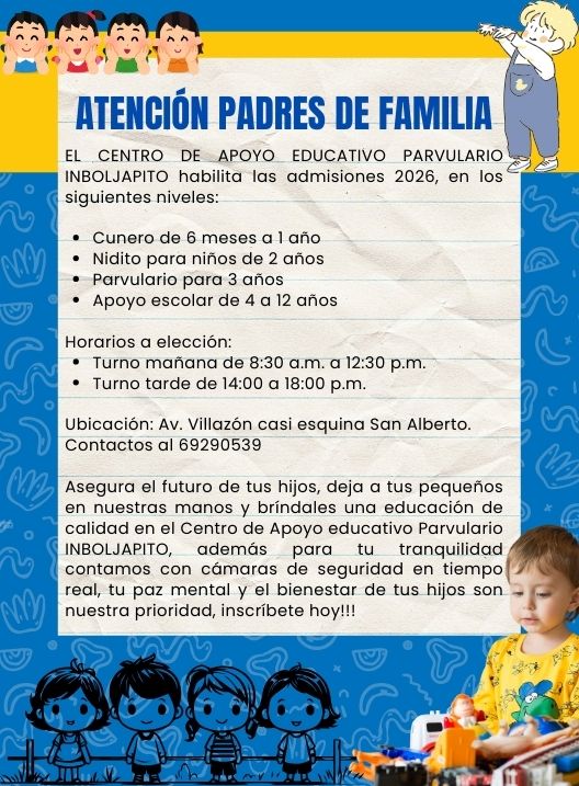 InicioRadio CambalacheCentro de Apoyo... Centro de Apoyo Educativo Parvulario INBOLJAPITO Por Equipo de Edición 5 enero, 2026 - 12:34 FacebookWhatsAppTwitter Últimas Noticias Mhoni Vidente revela los horóscopos del 5 al 8... Nacional Marcha de la COB desciende rumbo a La Paz para reunirse con el Gobierno ¿Sabía usted? Tres sacerdotes en busca de señales, magos que no hacen magia y la leyenda de una fiesta que une a pueblos y generaciones Internacional Cuba confirma la muerte de 32 militares de la isla en el ataque contra Venezuela Nacional ¡Confirmado! Estas son las fechas y el cronograma para las inscripciones escolares 2026 Continua leyendo Radio CambalacheTaller Gratuito sobre salud visual Radio CambalacheComunicado – Comunidad Franciscana Radio CambalacheInvitación a cursos: Arreglos florales y Producción agroecológica