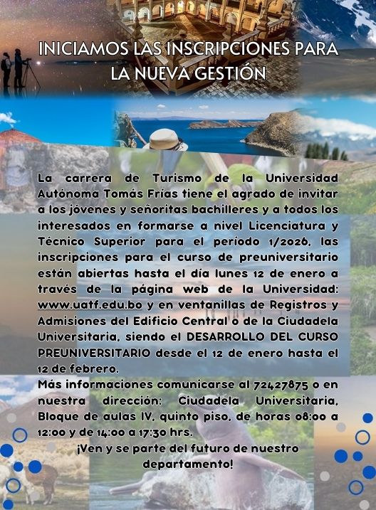InicioRadio CambalacheIniciamos las inscripciones... Iniciamos las inscripciones para la nueva gestión – Carrera de Turismo de la UATF Por Equipo de Edición 6 enero, 2026 - 12:03 FacebookWhatsAppTwitter Últimas Noticias Fiscalía investiga el fallecimiento de una joven de 18... Portada Cuatro personas pierden la vida en diferentes hechos de tránsito Seguridad Fiscalia investiga por parricidio a sujeto que habría quitado la vida a su madre en Yacuiba Seguridad Presidente del TSJ destaca actuación de Fiscal General en defensa de la Institucionalidad y la Independencia Judicial Deportes Ramiro Vaca vuelve a la selección Nacional Continua leyendo Radio CambalacheInvitación – Gran remate de juguetes, adornos navideños y ropa Radio CambalacheConvocatoria – Actualización del Estudio Diseño Técnico de Preinversión (EDTP) del Proyecto de Construcción Instituto Técnico INCOS Potosí D-8 Radio CambalacheLlega la Gran y Tradicional Feria de Reyes…