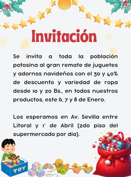 InicioRadio CambalacheInvitación - Gran... Invitación – Gran remate de juguetes, adornos navideños y ropa Por Equipo de Edición 6 enero, 2026 - 12:04 FacebookWhatsAppTwitter Últimas Noticias ABC registra seis puntos de bloqueos por motivos sociales Portada Fiscalía investiga el fallecimiento de una joven de 18 años Portada Cuatro personas pierden la vida en diferentes hechos de tránsito Seguridad Fiscalia investiga por parricidio a sujeto que habría quitado la vida a su madre en Yacuiba Seguridad Presidente del TSJ destaca actuación de Fiscal General en defensa de la Institucionalidad y la Independencia Judicial Continua leyendo Radio CambalacheIniciamos las inscripciones para la nueva gestión – Carrera de Turismo de la UATF Radio CambalacheConvocatoria – Actualización del Estudio Diseño Técnico de Preinversión (EDTP) del Proyecto de Construcción Instituto Técnico INCOS Potosí D-8 Radio CambalacheLlega la Gran y Tradicional Feria de Reyes…