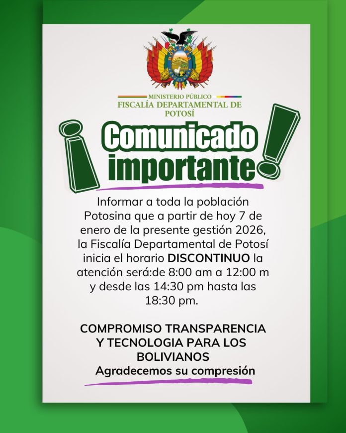 InicioRadio CambalacheComunicado Importante: Fiscalía... Comunicado Importante: Fiscalía Departamental de Potosí Por Equipo de Edición 7 enero, 2026 - 10:14 FacebookWhatsAppTwitter Últimas Noticias Alcalde subrogante promulgó la ley que define el pasaje... Portada Terminal de Buses suspende salidas a La Paz y Oruro Portada La Casa Nacional de Moneda calificó de exitosas las jornadas de feriado Seguridad Fiscalía anticorrupción dispone aprehensión de tres policías por uso indebido de influencias en Inspección Técnica vehicular en Oruro Seguridad Fiscalía investiga como homicidio culposo la muerte de un trabajador luego de la deflagración en una fábrica de explosivos en Santiváñez Continua leyendo Radio CambalacheCONVOCATORIA N° 001/2026 Radio CambalacheREQUERIMIENTO DE PERSONAL: AUXILIAR DE ALMACEN Y AUXILIAR CONTABLE Radio CambalacheInvitación – Gran remate de juguetes, adornos navideños y ropa