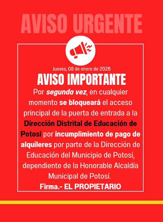 InicioRadio Cambalache¡Aviso Importante! ¡Aviso Importante! Por Equipo de Edición 8 enero, 2026 - 18:01 FacebookWhatsAppTwitter Últimas Noticias Accidente de tránsito en la ruta Tupiza–Cotagaita deja un... Portada Urgente: Comenzó el bloqueo de la ruta Potosí – Sucre Portada Se agudiza la escasez de gas en los barrios periurbanos Portada Transportistas tomaron la Alcaldía exigiendo respeto al acuerdo sobre el pasaje de Bs. 3 ¿Sabía usted? Encuentran un episodio perdido de El Chavo del 8 grabado en las playas de Cancún Continua leyendo Radio CambalacheCooperativa de Ahorro y Crédito de Vínculo Laboral 18 de Julio RL Radio CambalacheSeguro Social Universitario Potosí Radio CambalacheCooperativa de Ahorro y Crédito Societaria “San Martin” R.L.