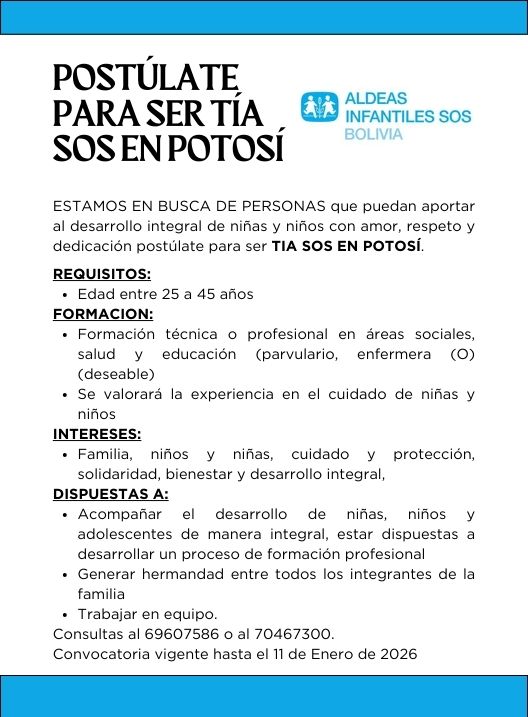 InicioRadio CambalachePostúlate para ser... Postúlate para ser Tía SOS en Potosí Por Equipo de Edición 8 enero, 2026 - 12:28 FacebookWhatsAppTwitter Últimas Noticias Encuentran un episodio perdido de El Chavo del 8... Nacional Maestros rurales bloquean al menos cuatro puntos en El Alto en rechazo al DS 5503 Nacional Los cocaleros del Chapare se suman al bloqueo de caminos contra el DS 5503 Portada Potosí amanece sin transporte urbano masivo por rechazo a ley de pasajes de Bs. 2,50 ¿Sabía usted? El peligroso oficio de pensar de Galileo: descubrió que la tierra se movía, que había otros planetas y fue perseguido por la iglesia Continua leyendo Radio CambalacheSeguro Social Universitario Potosí Radio CambalacheCooperativa de Ahorro y Crédito Societaria “San Martin” R.L. Radio CambalacheCursos vacacionales, Fundación INFOCAL Potosí