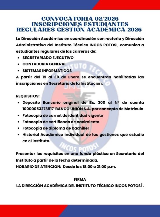 InicioRadio CambalacheConvocatoria 02/2026 -... Convocatoria 02/2026 – Inscripciones estudiantes regulares Gestión Académica 2026 Por Equipo de Edición 12 enero, 2026 - 13:05 FacebookWhatsAppTwitter Últimas Noticias ¿Qué presuntas irregularidades llevaron a la detención preventiva del... ¿Sabía usted? Quienes tuvieron COVID-19 son más vulnerables al virus de la súper gripe H3N2 Internacional Apagón de internet en Irán: así funciona el arma digital de los regímenes autoritarios para acallar a la población Cultura y Espectáculos ‘Adolescencia’ y ‘Una batalla tras otra’ triunfan en los Globos de Oro de 2026; ‘Sirât’ se va de vacío Nacional “La subvención se eliminó y eso es una conquista económica que no va a cambiar”, remarca el presidente Paz Continua leyendo Radio CambalacheConvocatoria 001/2026 – Admisión de estudiantes nuevos Gestión Académica 2026 Radio CambalacheMundo de Colores… ofrece apoyo psicopedagógico Radio CambalacheInvitación – Carrera de Estadística