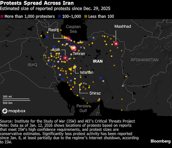 Las protestas se extienden por todo Irán. Tamaño estimado de las protestas reportadas desde el 29 de dic. de 2025.
