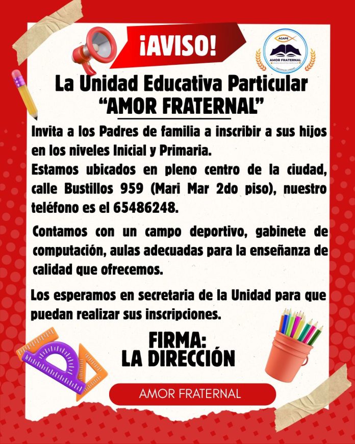 InicioRadio CambalacheINSCRIPCIONES ABIERTAS DE... INSCRIPCIONES ABIERTAS DE LA U.E. PARTICULAR “AMOR FRATERNAL” Por Equipo de Edición 22 enero, 2026 - 13:51 FacebookWhatsAppTwitter Últimas Noticias Justicia rechaza pedido de juicio de responsabilidades para Arce... Portada Bomberos inicia cursos de capacitación en rescate y primeros auxilios a mineros cooperativistas Nacional Caen dos pasajeros llevando 163 kilos de marihuana Cultura y Espectáculos Kendrick Lamar, Lady Gaga y Bad Bunny encabezan las nominaciones de los Grammy 2026 Nacional Cumbre multipartidaria: El TSE se reúne este jueves con organizaciones políticas con cinco temas en agenda Continua leyendo Radio CambalacheREQUERIMIENTO DE PERSONAL PARA PARKANO Radio CambalacheREQUERIMIENTO DE PERSONAL: REGENTE NOCTURNO Radio CambalacheINSCRIPCIONES ABIERTAS UNIDAD EDUCATIVA “FRAY JOSÉ ANTONIO ZAMPA” Y UNIDAD EDUCATIVA PLENA “FRAY SERGIO CASTELLI”