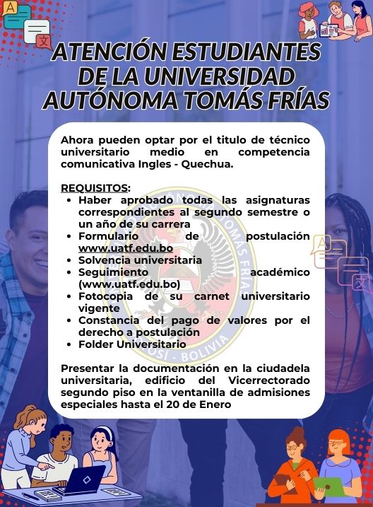 InicioRadio CambalacheAtención estudiantes de... Atención estudiantes de la Universidad Autónoma Tomás Frías… Por Equipo de Edición 26 enero, 2026 - 11:59 FacebookWhatsAppTwitter Últimas Noticias Mhoni Vidente revela los horóscopos de la semana del... Cultura y Espectáculos Llallagua conquistó las máximas coronas del Miss Potosí 2026 Deportes Villegas: “Es un desacierto de todos” Portada Uyuni: Aprehenden a joven de 18 años con sustancias controladas Portada Deflagración por fuga de gas deja una mujer herida en zona Barrio Lindo Continua leyendo Radio CambalacheInvitación – Carrera de Lingüística e Idiomas Radio CambalachePromoción de fin de mes e inicio de clases!!! Radio CambalacheUnidad Educativa Nocturna N° 3 Humberto Quezada Gestión 2026