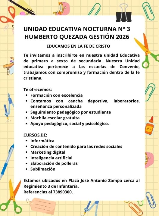 InicioRadio CambalacheUnidad Educativa Nocturna... Unidad Educativa Nocturna N° 3 Humberto Quezada Gestión 2026 Por Equipo de Edición 26 enero, 2026 - 11:57 FacebookWhatsAppTwitter Últimas Noticias Llallagua conquistó las máximas coronas del Miss Potosí 2026 Deportes Villegas: “Es un desacierto de todos” Portada Uyuni: Aprehenden a joven de 18 años con sustancias controladas Portada Deflagración por fuga de gas deja una mujer herida en zona Barrio Lindo Internacional Alerta en India: confirman cinco casos del letal virus Nipah cerca de Calcuta Continua leyendo Radio CambalachePromoción de fin de mes e inicio de clases!!! Radio CambalacheInvitación de la huerta a tu mesa Radio CambalacheAtención Potosí, AVÍCOLA Rolón está con una promoción de locura