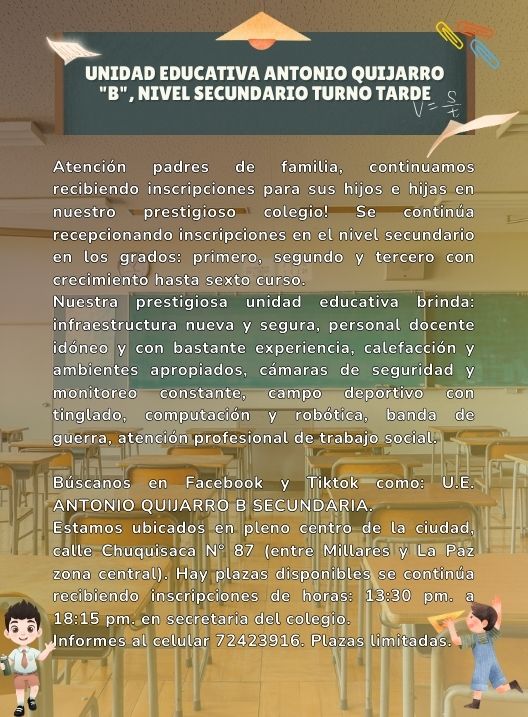 Unidad Educativa Antonio Quijarro “B”, Nivel Secundario Turno Tarde