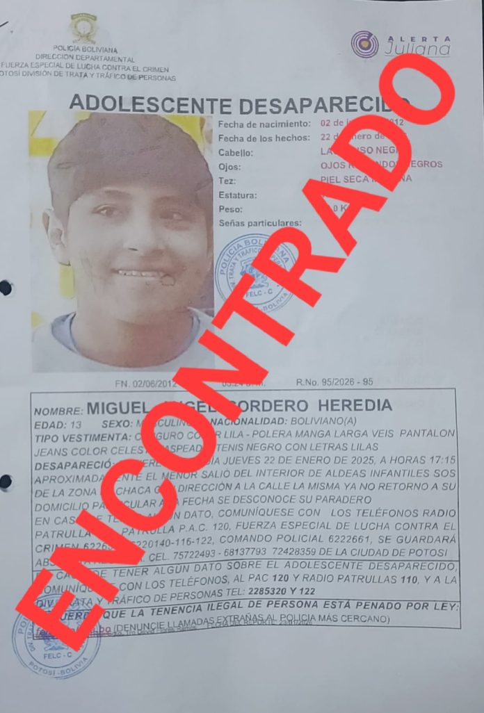 InicioRadio CambalacheAVISO DE BIEN... AVISO DE BIEN SOCIAL- PERSONA ENCONTRADA Por Equipo de Edición 28 enero, 2026 - 14:00 FacebookWhatsAppTwitter Últimas Noticias Alerta sanitaria en Uyuni tras fisura en dique de... Nacional Sin entregar el bastón de mando, Paz arriba a Panamá para participar del Foro Económico de la CAF Nacional Comunidades de Nor Lípez denuncian que YLB desconoció protocolo de consulta para la explotación de litio Portada Concejo Municipal de Potosí rendirá homenaje póstumo a la periodista Jannett Esperanza Cortez Parra Portada Tupiza: Adolescente fue arrastrado por el agua de una quebrada Continua leyendo Radio CambalacheREQUERIMIENTO DE PERSONAL- OPERARIO Radio CambalacheInscripciones abiertas Gestión 2026 Primer Semestre Radio CambalacheConstruye tu futuro en INBOLJAP