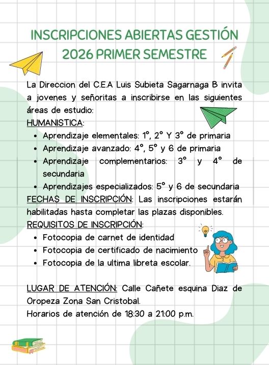 InicioRadio CambalacheInscripciones abiertas Gestión... Inscripciones abiertas Gestión 2026 Primer Semestre Por Equipo de Edición 28 enero, 2026 - 12:01 FacebookWhatsAppTwitter Últimas Noticias Alerta sanitaria en Uyuni tras fisura en dique de... Nacional Sin entregar el bastón de mando, Paz arriba a Panamá para participar del Foro Económico de la CAF Nacional Comunidades de Nor Lípez denuncian que YLB desconoció protocolo de consulta para la explotación de litio Portada Concejo Municipal de Potosí rendirá homenaje póstumo a la periodista Jannett Esperanza Cortez Parra Portada Tupiza: Adolescente fue arrastrado por el agua de una quebrada Continua leyendo Radio CambalacheCONVOCATORIA N° 003/2026 Radio CambalacheREQUERIMIENTO DE PERSONAL: ENCARGADO DE SUCURSAL Radio CambalacheREQUERIMIENTO DE PERSONAL- OPERARIO