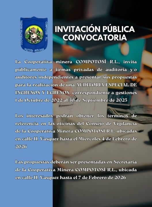 InicioRadio CambalacheInvitación Pública -... Invitación Pública – Convocatoria Por Equipo de Edición 28 enero, 2026 - 11:59 FacebookWhatsAppTwitter Últimas Noticias Alerta sanitaria en Uyuni tras fisura en dique de... Nacional Sin entregar el bastón de mando, Paz arriba a Panamá para participar del Foro Económico de la CAF Nacional Comunidades de Nor Lípez denuncian que YLB desconoció protocolo de consulta para la explotación de litio Portada Concejo Municipal de Potosí rendirá homenaje póstumo a la periodista Jannett Esperanza Cortez Parra Portada Tupiza: Adolescente fue arrastrado por el agua de una quebrada Continua leyendo Radio CambalacheInscripciones abiertas Gestión 2026 Primer Semestre Radio CambalacheConstruye tu futuro en INBOLJAP Radio CambalacheUniversidad Católica Boliviana San Pablo Sede La Plata Sucre