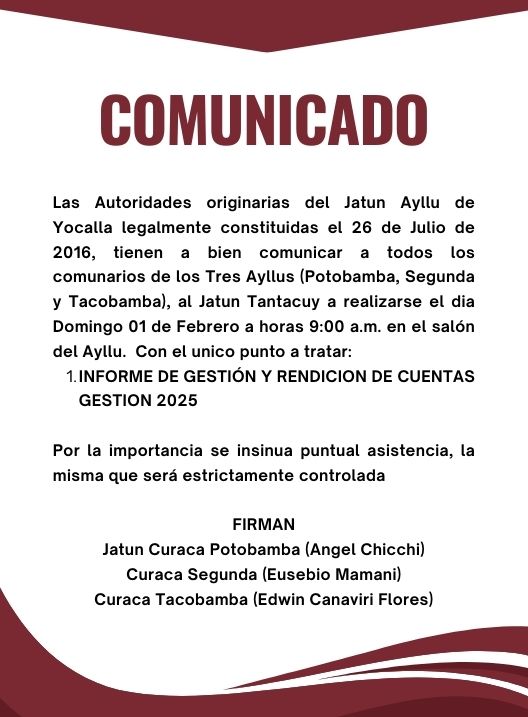 InicioRadio CambalacheComunicado - Autoridades... Comunicado – Autoridades del Jatun Ayllu de Yocalla Por Equipo de Edición 30 enero, 2026 - 12:28 FacebookWhatsAppTwitter Últimas Noticias Violento asalto minero en Potosí: roban más de una... Horóscopo Mhoni Vidente revela los horóscopos para el fin de semana del 30 de enero al 2 de febrero ¿Sabía usted? Científicos de EEUU alertan sobre la circulación de gripe D en vacas y coronavirus canino ¿Sabía usted? Por qué es tan difícil dejar de comer papas fritas, según la ciencia ¿Sabía usted? Los beneficios secretos de la risa: por qué es clave para el bienestar diario, según expertos Continua leyendo Radio CambalacheParvulario Tomás Frías Radio CambalacheCooperativa Minera Porco R.L. Radio CambalacheCooperativa Minera Porco R.L.
