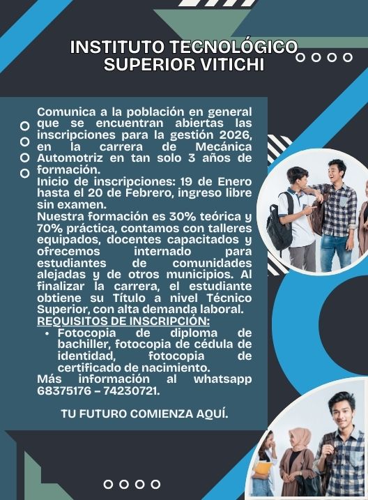 InicioRadio CambalacheInvitación - Instituto... Invitación – Instituto Tecnológico Superior Vitichi Por Equipo de Edición 4 febrero, 2026 - 12:22 FacebookWhatsAppTwitter Últimas Noticias Detenidos la amiga y el novio de una menor... Nacional Madre y bebé mueren tras parto en su domicilio en Viacha Portada Destacada Vehículo impacta contra inmueble por presunta falla de frenos Portada Transporte público retoma operaciones luego de casi 4 días Portada Presentan acción popular por conflicto de tarifas del transporte urbano en Potosí Continua leyendo Radio CambalacheKinder “El Minero”, inscripciones abiertas Radio CambalacheCentro de Educación Alternativa ETA San Ignacio de Loyola Radio CambalachePinta tus vacaciones de color… Taller de arte Pincelitos de color