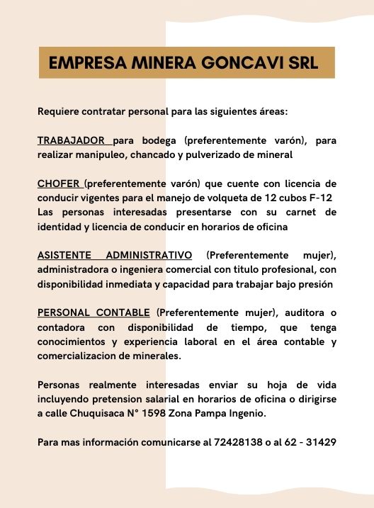 InicioRadio CambalacheRequerimiento de personal... Requerimiento de personal – Empresa Minera GONCAVI SRL Por Equipo de Edición 12 febrero, 2026 - 11:22 FacebookWhatsAppTwitter Últimas Noticias Así como su amado “León de las Alturas”: Jaime... Portada Suspendieron la audiencia cautelar contra Josefina Cruz y Lesly Flores Portada Presentan denuncia contra miembros de la directiva de la ALDP Portada A horas del jueves de comadres el precio de la carne continúa por las nubes Portada Trabajadores municipales de Tupiza cumplieron paro de 24 horas Continua leyendo Radio CambalacheEl arte no solo se aprende, se vive… Radio CambalacheArtesanías “POCHITA”, empaque de lujo Radio CambalacheFuneraria Asunción, realiza atención a la población potosina las 24 horas de lunes a domingo