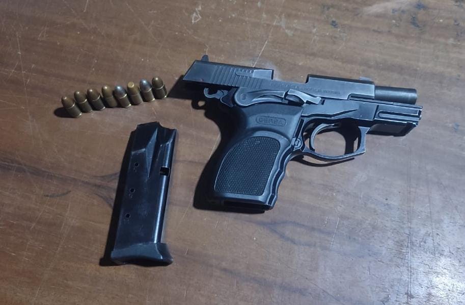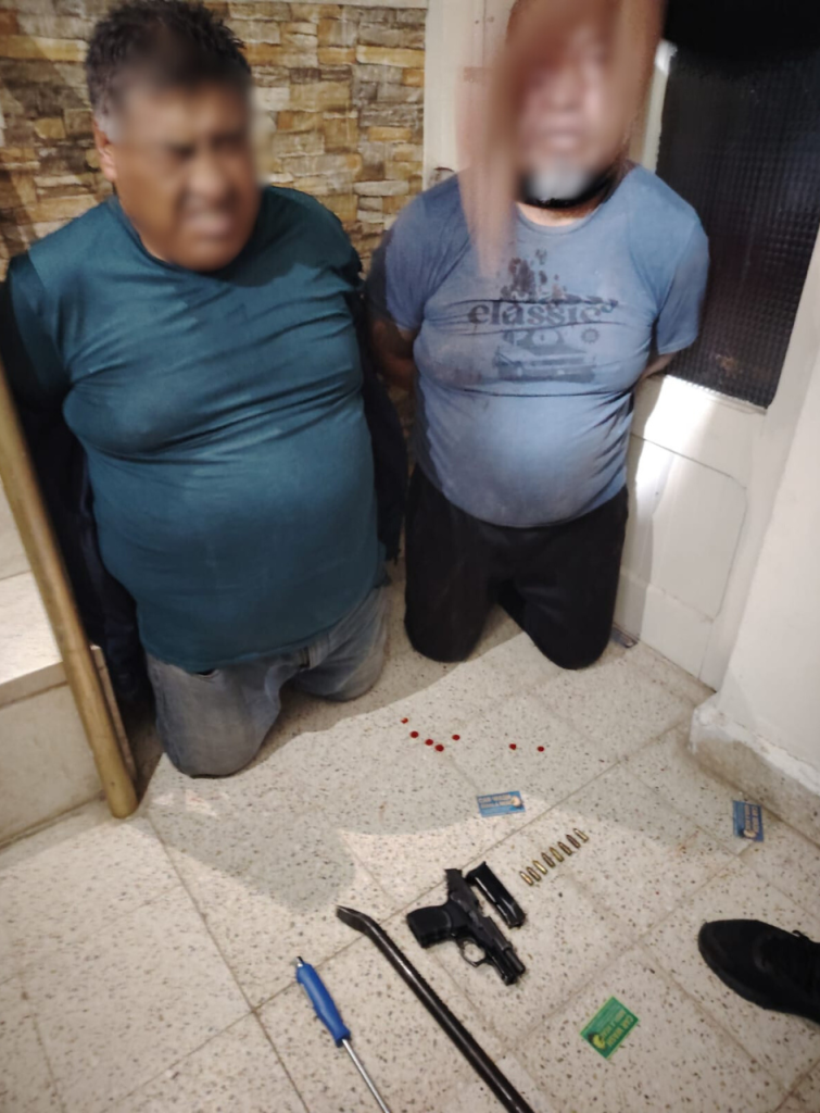 Durante la intervención se secuestró una pistola calibre 9 milímetros marca Bersa, ocho proyectiles sin percutar, herramientas utilizadas para forzar puertas y objetos cortopunzantes.