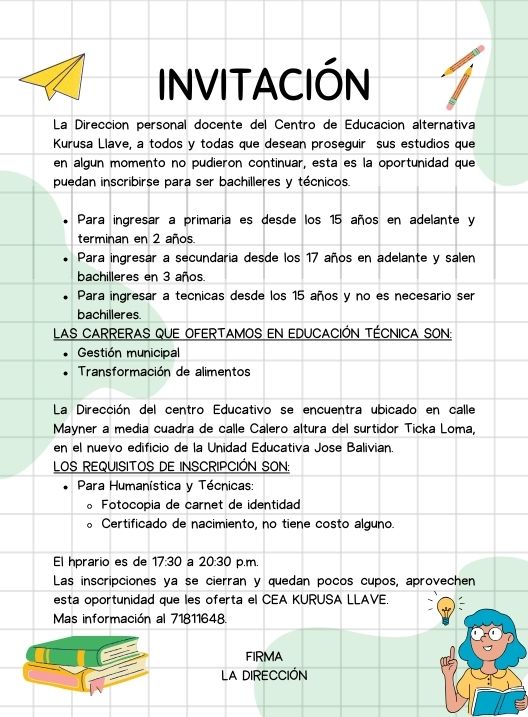 InicioRadio CambalacheInvitación - Centro... Invitación – Centro de Educación Alternativa Kurusa Llave Por Equipo de Edición 20 febrero, 2026 - 11:52 FacebookWhatsAppTwitter Últimas Noticias Mhoni Vidente y la alineación de Fin de Semana:... Portada Triple colisión de vehículos se produjo anoche en la carretera Potosí – Sucre Portada Brigada Parlamentaria de Potosí advierte: “Todo acuerdo internacional sobre el litio debe pasar por la Asamblea” Portada Tarapaya se viste de fiesta: Lanzan oficialmente el Carnaval 2026 en el Distrito 13 Portada Potosí se prepara para el sorteo de jurados electorales rumbo a las Subnacionales 2026 Continua leyendo Radio CambalacheRequerimiento de personal: Auxiliar Contable Radio CambalacheInvitación – Entrada Corso Departamental “Ciudad de Plata” Potosí Radio CambalacheEstudia la Carrera de Electrónica del Instituto Tecnológico Nuevo Amanecer