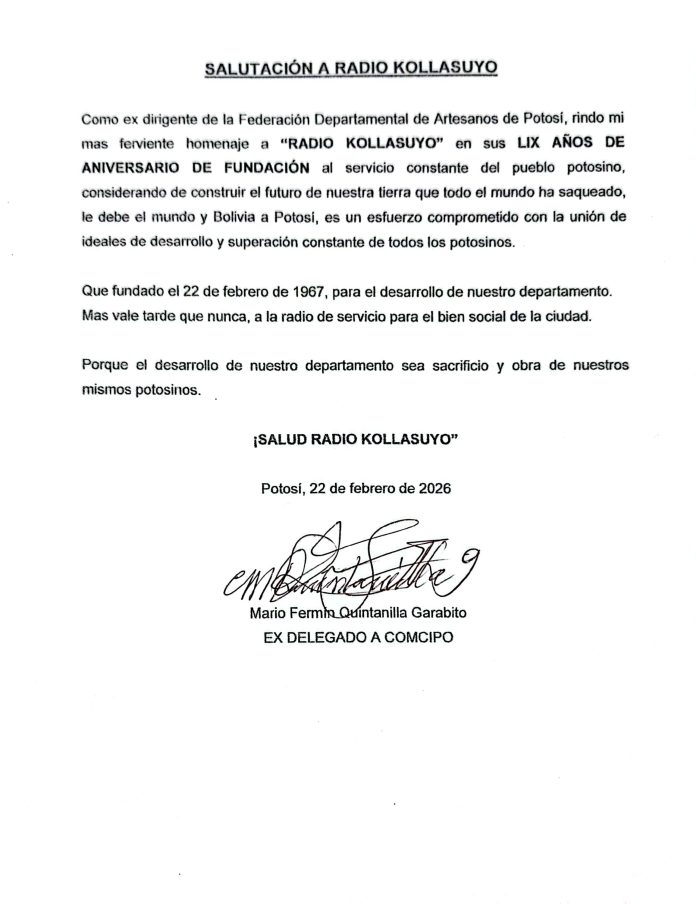 InicioRadio CambalacheSalutación a Radio... Salutación a Radio Kollasuyo Por Equipo de Edición 24 febrero, 2026 - 13:07 FacebookWhatsAppTwitter Últimas Noticias Uncía: Investigan muerte de adulta mayor en la comunidad... Internacional La crisis en México pone en peligro los partidos de la repesca para el Mundial de 2026 de selecciones como Bolivia o Irak ¿Sabía usted? El mito sobre cómo calmar la ira: por qué desahogarse puede empeorar el enojo Portada Rossana, quien representó a Bolivia en Viña del Mar, recibió un disparo en la cabeza; el sindicado es su esposo ¿Sabía usted? Un futbolista le pidió matrimonio a su novia en el campo de juego y se separó a los tres días: “No voy a hablar... Continua leyendo Radio CambalacheCOMUNICADO POLICIAL Radio CambalacheREQUERIMIENTO DE PERSONAL: ENCARGADO DE SUCURSAL Radio CambalacheConvocatoria Laboral – Sociedad Minera Metalúrgica Korincho SRL