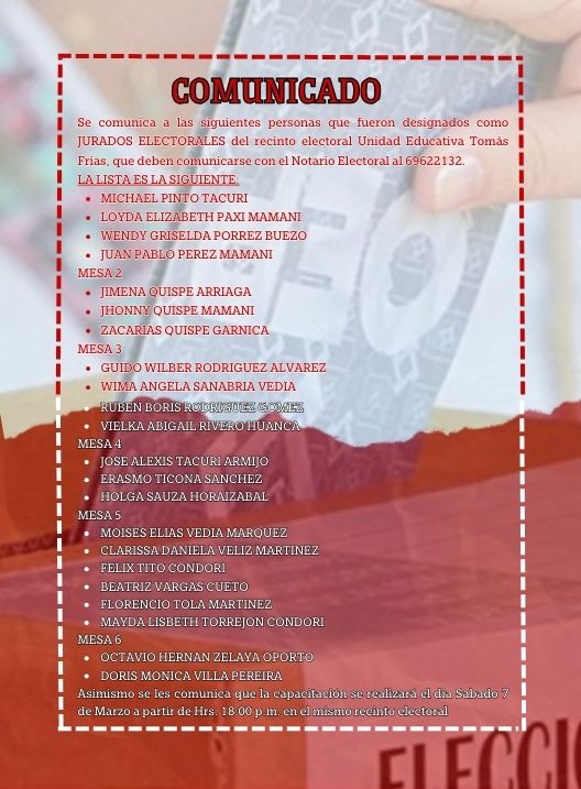 InicioRadio CambalacheComunicado - Jurados... Comunicado – Jurados electorales del recinto “Unidad Educativa Tomás Frías” Por Equipo de Edición 26 febrero, 2026 - 12:35 FacebookWhatsAppTwitter Últimas Noticias Aprehenden a la alcaldesa Reis a su llegada al... Portada Municipio oficializa el Día del Peatón para este domingo 1 de marzo Portada Unidad Educativa C. Medinaceli migra a clases virtuales por casos de varicela Portada Llallagua: Policía halla a menor de 13 años reportada como desaparecida en compañía de un joven de 21 Nacional Presidente de la CAF llega a Bolivia y dice que hará anuncios de proyectos junto con Rodrigo Paz Continua leyendo Radio CambalacheAtención Potosí, Avícola Rolón está con una promoción de locura Radio CambalacheConvocatoria Pública externa N° 001/2026 Radio CambalacheConvocatoria para Directores Técnicos
