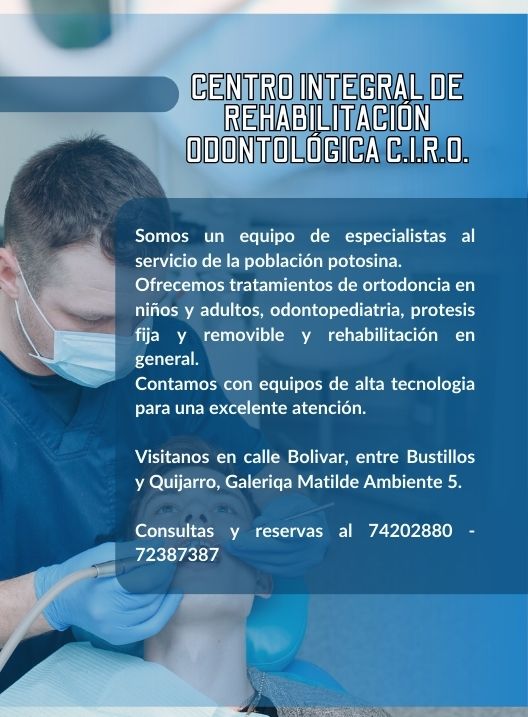 InicioRadio CambalacheCentro Integral de... Centro Integral de Rehabilitación Odontologica C.I.R.O. Por Equipo de Edición 3 marzo, 2026 - 12:33 FacebookWhatsAppTwitter Últimas Noticias Fiscalía amplía investigación por presuntas resoluciones contrarias a la... Portada Hospital Natalini activó protocolo antiexplosivo tras hallazgo de dinamita en bolsillo de un paciente Portada Brote de varicela obliga al cierre de unidades educativas y desinfecciones masivas en Potosí Portada Éxodo rural en Potosí obliga a un reordenamiento de ítems educativos para 2026 Portada COMCIPO convoca a “Pre-Cumbre” para definir el futuro de la Ley del Litio y sus regalías Continua leyendo Radio CambalacheAcademia de Música RIFSON Radio CambalacheFábrica de Cemento Cola Klaucola Potosí Radio CambalacheToyosa S.A. Regional Potosí requiere un pasante administrativo comercial