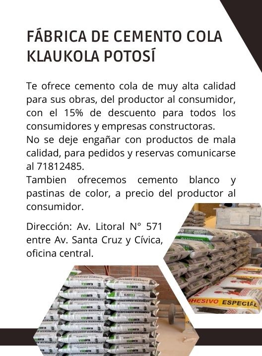 InicioRadio CambalacheFábrica de Cemento... Fábrica de Cemento Cola Klaucola Potosí Por Equipo de Edición 3 marzo, 2026 - 12:32 FacebookWhatsAppTwitter Últimas Noticias Fiscalía amplía investigación por presuntas resoluciones contrarias a la... Portada Hospital Natalini activó protocolo antiexplosivo tras hallazgo de dinamita en bolsillo de un paciente Portada Brote de varicela obliga al cierre de unidades educativas y desinfecciones masivas en Potosí Portada Éxodo rural en Potosí obliga a un reordenamiento de ítems educativos para 2026 Portada COMCIPO convoca a “Pre-Cumbre” para definir el futuro de la Ley del Litio y sus regalías Continua leyendo Radio CambalacheCentro Integral de Rehabilitación Odontologica C.I.R.O. Radio CambalacheToyosa S.A. Regional Potosí requiere un pasante administrativo comercial Radio CambalacheToyosa S.A. Regional Potosí requiere un pasante para taller