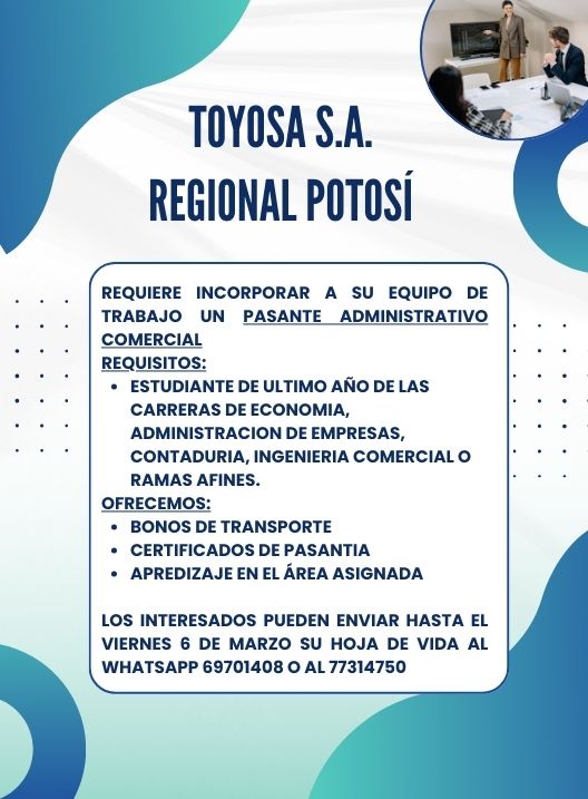 InicioRadio CambalacheToyosa S.A. Regional... Toyosa S.A. Regional Potosí requiere un pasante administrativo comercial Por Equipo de Edición 3 marzo, 2026 - 12:31 FacebookWhatsAppTwitter Últimas Noticias Fiscalía amplía investigación por presuntas resoluciones contrarias a la... Portada Hospital Natalini activó protocolo antiexplosivo tras hallazgo de dinamita en bolsillo de un paciente Portada Brote de varicela obliga al cierre de unidades educativas y desinfecciones masivas en Potosí Portada Éxodo rural en Potosí obliga a un reordenamiento de ítems educativos para 2026 Portada COMCIPO convoca a “Pre-Cumbre” para definir el futuro de la Ley del Litio y sus regalías Continua leyendo Radio CambalacheFábrica de Cemento Cola Klaucola Potosí Radio CambalacheToyosa S.A. Regional Potosí requiere un pasante para taller Radio CambalacheComunicado – Jurados Electorales del recinto “Unidad Educativa Cleto Loayza”