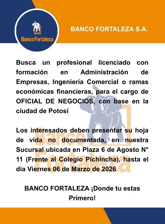 InicioRadio CambalacheBanco Fortaleza S.A.... Banco Fortaleza S.A. requiere un profesional para el cargo de Oficial de Negocios Por Equipo de Edición 4 marzo, 2026 - 12:09 FacebookWhatsAppTwitter Últimas Noticias Guerra familiar por la plata: 18 heridos tras violento... Portada El padre fue quien encontró a sus cinco hijos y a su esposa sin vida, ahora está arrestado Seguridad Oruro: Detención preventiva para dos adolescentes investigados por feminicidio en Caracollo Seguridad Santa Cruz: Fiscalía investiga a joven aprehendido por homicidio en el Plan 3.000 Deportes El “Inde” se impone a penales a Guabirá para avanzar en la Sudamericana Continua leyendo Radio CambalacheComunicado – Jurados electorales del recinto “Escuela Cobija” Radio CambalachePinta tus vacaciones de color… Radio CambalacheComunicado – Jurados electorales del recinto “Inicial El Minero”