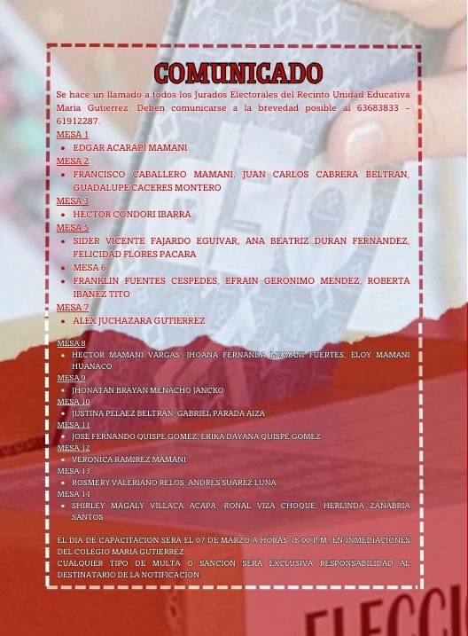 InicioRadio CambalacheComunicado - Jurados... Comunicado – Jurados electorales del recinto “Unidad Educativa María Gutiérrez “ Por Equipo de Edición 4 marzo, 2026 - 12:07 FacebookWhatsAppTwitter Últimas Noticias El padre fue quien encontró a sus cinco hijos... Seguridad Oruro: Detención preventiva para dos adolescentes investigados por feminicidio en Caracollo Seguridad Santa Cruz: Fiscalía investiga a joven aprehendido por homicidio en el Plan 3.000 Deportes El “Inde” se impone a penales a Guabirá para avanzar en la Sudamericana Seguridad Síntesis del partido Independiente (0) (3) VS. Guabirá (0) (2) Continua leyendo Radio CambalacheInvitación – Unidad Educativa “12 de Abril” Radio CambalacheComunicado – Jurados electorales del recinto “José Alonso de Ibañez” Radio CambalacheTodo Muebles Bolivia invita al Gran Remate de sus productos