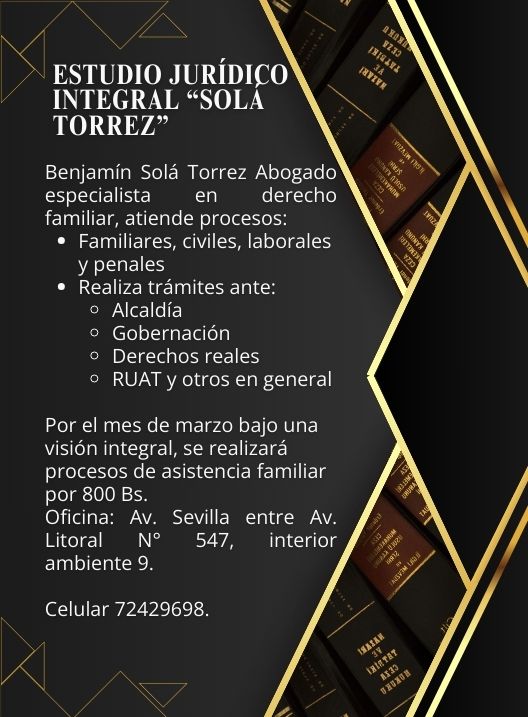 InicioRadio CambalacheEstudio Jurídico Integral... Estudio Jurídico Integral “Solá Torrez” Por Equipo de Edición 5 marzo, 2026 - 11:45 FacebookWhatsAppTwitter Últimas Noticias Seis heridos en violento choque frontal en la ruta... Nacional Pobreza y deudas, entre los móviles que investiga la Fiscalía por el múltiple infanticidio y suicidio de Sacaba Portada Churata, Pérez, Soraide y Nina estarán sentados en el banquillo de los acusados este jueves Portada Anuncian que sesión ordinaria del Concejo Municipal será suspendida este jueves por falta de quorum Portada ¡Una vergüenza!: así califican a la actual gestión municipal de Potosí Continua leyendo Radio CambalacheAtención a toda la población potosina… Gran Inauguración de QUINTA MALQUERIDA Radio CambalacheComunicado – Jurados electorales del recinto “Unidad Educativa Hugo Chávez Frías” Radio CambalacheComunicado – Asociación de ex trabajadores Mineros Rentistas cooperativistas y Derechohabientes de Potosí
