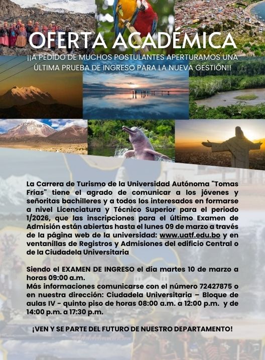 InicioRadio CambalacheOferta Académica... Carrera... Oferta Académica… Carrera de Turismo de la UATF Por Equipo de Edición 6 marzo, 2026 - 12:42 FacebookWhatsAppTwitter Últimas Noticias Juez envía a concejales Churata, Nina, Pérez y Soraide... Portada Ofrecen Bs. 30.000 a quienes revelen actos de corrupción de Reyna Menacho y Mayra Churata Portada Hoy arranca la Precumbre del Litio en la UATF Portada Crisis municipal “tocó fondo” con la suspensión de sesión por falta de quorum Portada Comunarios de Karachipampa advierten con aplicar a “justicia por mano propia” a ladrones Continua leyendo Radio CambalacheConvocatoria – FEDECOMIN POTOSÍ R.L. Radio CambalacheComunicado – Jurados electorales del recinto “Inicial El Minero” Radio CambalacheEstudio Jurídico Integral “Solá Torrez”