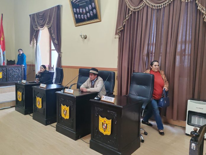 En la sesión de hoy participan el presidente Emilio Elías y los siguientes concejales: Mayra Churata Huanca, Reyna Menacho Ala, Vidal Quispe Callapa, René Mamani Huallpa y Sulma Ibarra Pacara – ya fue habilitada –; mientras que Mirtha Guzmán renunció una vez instalada la sesión extraordinaria.