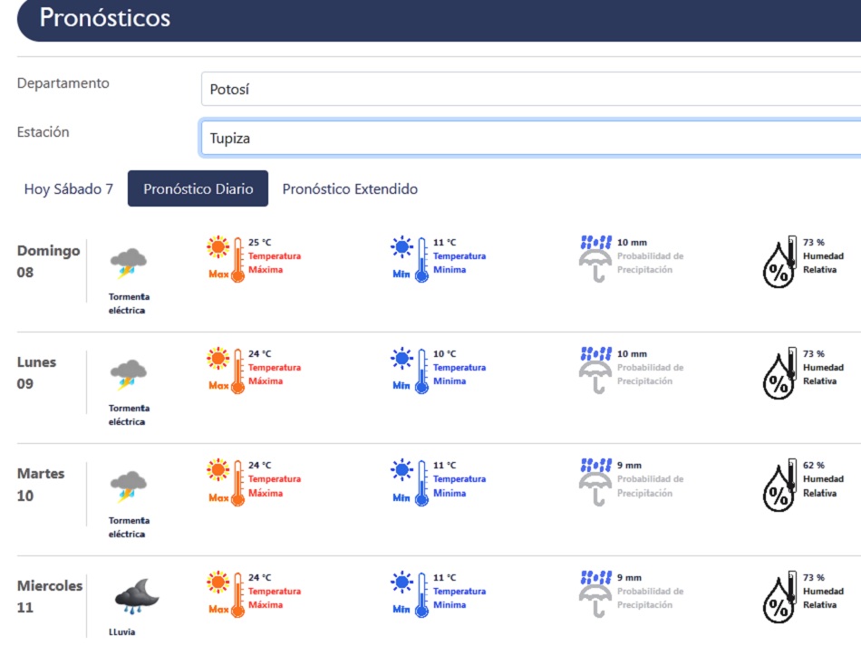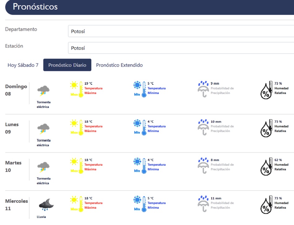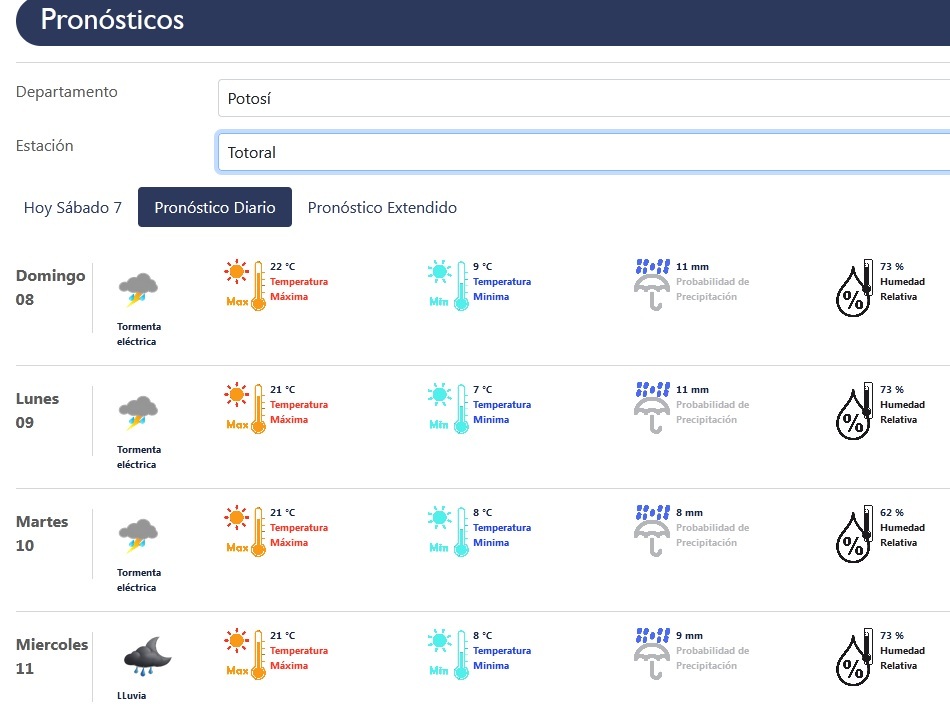 Las tormentas eléctricas y lluvias estarán presentes en gran parte del departamento de Potosí hasta el miércoles de la semana que viene, de acuerdo al pronóstico del Servicio Nacional de Meteorología e Hidrología (Senamhi).