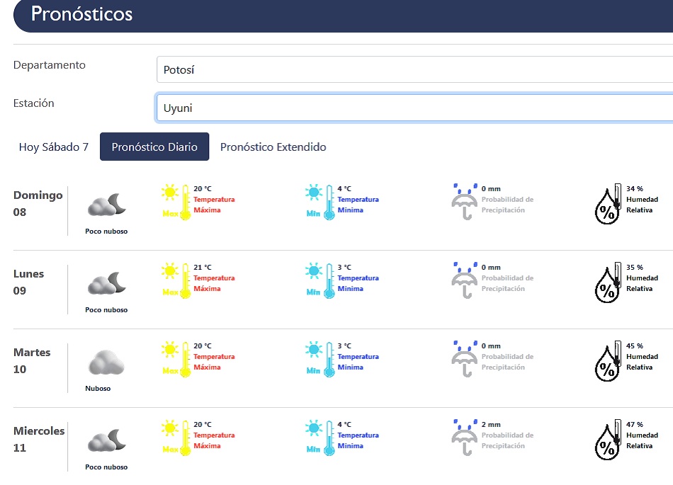 En esta parte del territorio potosino, el cielo estará entre poco nuboso a nublado y las temperaturas mínimas variarán entre 3 y 4 grados; en tanto que las máximas marcarán entre 20 y 21 °C, con una humedad de, al menos, 34 por ciento, de acuerdo al pronóstico del Senamhi.
