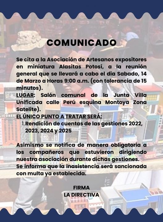 InicioRadio CambalacheComunicado - Asociación... Comunicado – Asociación de Artesanos expositores en miniatura Alasitas Potosí Por Equipo de Edición 13 marzo, 2026 - 13:28 FacebookWhatsAppTwitter Últimas Noticias Gobierno dice que no hubo participación de la DEA... ¿Sabía usted? Día mundial del sueño: No se trata sólo de dormir más, sino de tener calidad de descanso Portada Cumbre Minera del Sud busca consolidar una agenda para el desarrollo del sector en Tupiza Portada Alerta en Betanzos: sequía extrema amenaza con disparar el precio de la papa y agotar las semillas Portada Golpe al narcotráfico en Potosí: desmantelan red de producción con 12,6 toneladas de marihuana Continua leyendo Radio CambalacheComunicado – Jurados electorales del recinto “Escuela Daniel Campos” Radio CambalacheCentro de capacitación ISBE Radio CambalacheSalutación – Unidad Educativa Juan Pablo II – B Nivel Inicial