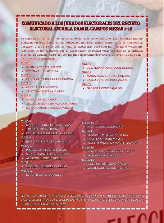 InicioRadio CambalacheComunicado - Jurados... Comunicado – Jurados electorales del recinto “Escuela Daniel Campos” Por Equipo de Edición 13 marzo, 2026 - 13:30 FacebookWhatsAppTwitter Últimas Noticias Gobierno dice que no hubo participación de la DEA... ¿Sabía usted? Día mundial del sueño: No se trata sólo de dormir más, sino de tener calidad de descanso Portada Cumbre Minera del Sud busca consolidar una agenda para el desarrollo del sector en Tupiza Portada Alerta en Betanzos: sequía extrema amenaza con disparar el precio de la papa y agotar las semillas Portada Golpe al narcotráfico en Potosí: desmantelan red de producción con 12,6 toneladas de marihuana Continua leyendo Radio CambalacheSalutación al XII Aniversario de la Unidad Educativa Juan Pablo II – A Radio CambalacheComunicado – Jubilados y derechohabientes del ex Servicio Nacional de Caminos Radio CambalacheComunicado – Asociación de rentistas cooperativistas del sistema integral de pensiones