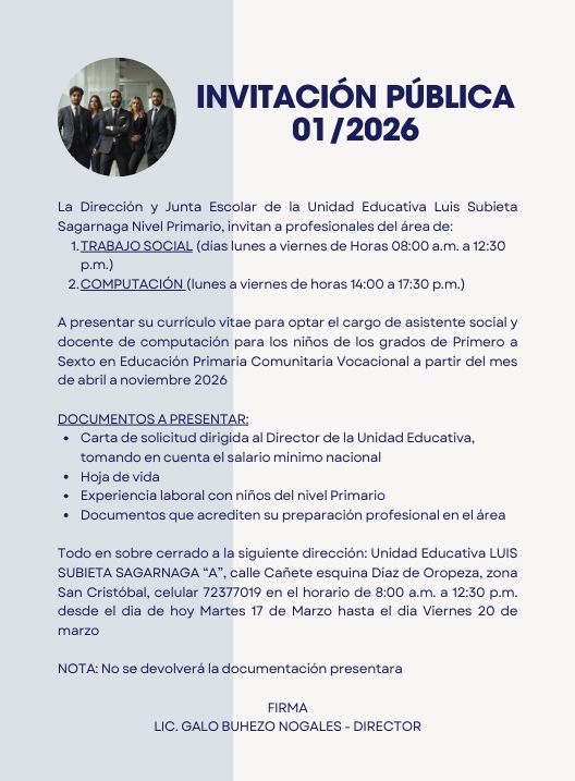 InicioRadio CambalacheInvitación Pública 01/2026... Invitación Pública 01/2026 – Unidad Educativa Luis Subieta Sagárnaga Por Equipo de Edición 17 marzo, 2026 - 11:53 FacebookWhatsAppX Últimas Noticias Vecinos del Distrito N°20 rechazan la toma de la... Portada FELCC reporta robo de 3 toneladas de mineral en Agua Dulce Portada Fin del conflicto en Colavi: Asamblea aprueba adenda presupuestaria y se levanta el bloqueo Nacional ¿Quién es la joven aprehendida en el operativo para capturar a Marset? Portada Dos accidentes en la carretera La Paz-Copacabana dejan un muerto y seis heridos Continua leyendo Radio CambalacheComunicado – Jurados electorales del recinto “Unidad Educativa Tomás Frías” Radio CambalacheComunicado – Jurados del recinto electoral “Humberto Iporre Salinas” Radio CambalacheFederación Departamental Sindical de Choferes “1° de Mayo”