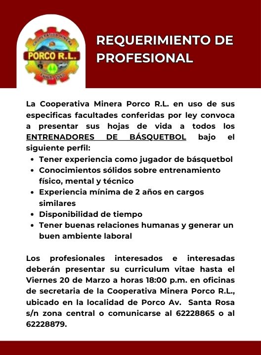 InicioRadio CambalacheRequerimiento de profesional... Requerimiento de profesional – Cooperativa Minera Porco R.L. Por Equipo de Edición 18 marzo, 2026 - 12:00 FacebookWhatsAppX Últimas Noticias Zendaya elogia a Tom Holland y adelanta detalles de... Portada Justicia para Lagunillas: juicio oral por el incendio del bus escolar que cobró cinco vidas de niños entra en su fase final Portada Violencia en Cotagaita: Fiscalía investiga ataque a comando policial tras operativo contra autos robados en Chile Portada Potosí bajo Auto de Buen Gobierno: rigen restricciones por las Elecciones Subnacionales del 22 de marzo Portada Vecinos del Distrito 4 alertan riesgo de perder Bs 78 millones para hospital por falta de alcalde Continua leyendo Radio CambalacheConvocatoria Laboral – IMVET SRL Radio CambalacheInvitación – Comunidad Franciscana y la Asociación de Carpinteros Radio CambalacheInvitación – Actos en Honor a San José