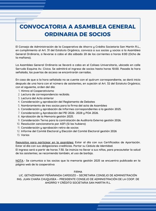 InicioRadio CambalacheConvocatoria a Asamblea... Convocatoria a Asamblea General Ordinaria de Socios Por Equipo de Edición 19 marzo, 2026 - 12:07 FacebookWhatsAppX Últimas Noticias Asegurados de Uyuni toman la CNS para evitar traslado... Portada Alerta en Betanzos: fachada de la ex-subprefectura en riesgo de colapso tras fuerte granizada Portada Desastre en Betanzos: granizada devasta siete comunidades y deja a más de 300 familias en emergencia Portada UATF destaca acreditación internacional de sus carreras y proyecta nuevos avances académicos Portada Fiscalía de Potosí activa plan para garantizar atención durante las elecciones del 22 de marzo Continua leyendo Radio CambalacheSalutación al Dia del Padre – Asociación de hijos de excombatientes de la Guerra del Chaco Potosí Radio CambalacheSalutación – Servicio de Impuestos Nacionales Radio CambalacheSalutación al Padre Pichincheño