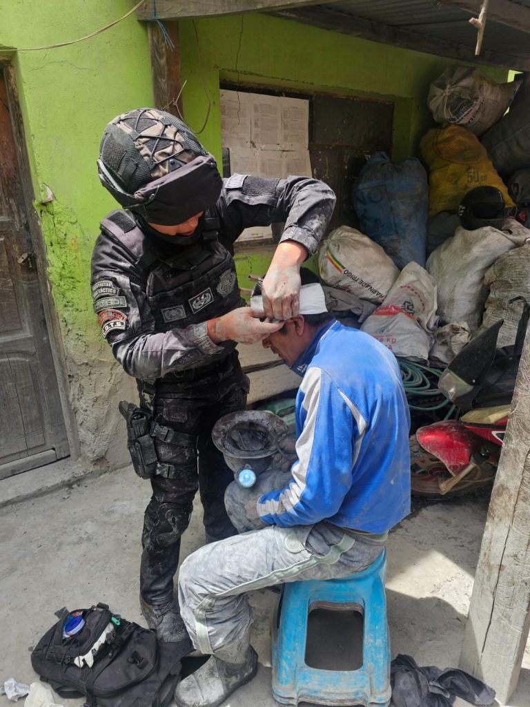 Ante esta situación, el personal policial aguardó un tiempo prudente antes de continuar con el operativo. Posteriormente, se evidenció la salida de cuatro presuntos “jucus”, quienes presentaban heridas ocasionadas presuntamente durante un enfrentamiento con trabajadores mineros. Los heridos fueron retirados del lugar y trasladados en un vehículo de Radio Patrullas 110.