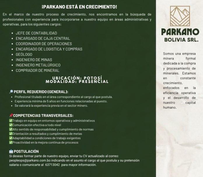 InicioRadio CambalachePARKANO BOLIVIA SRL... PARKANO BOLIVIA SRL REQUIERE INCORPORAR PERSONAL A SU EQUIPO DE TRABAJO Por Equipo de Edición 23 marzo, 2026 - 11:58 FacebookWhatsAppX Últimas Noticias Aprehenden a un hombre por instigar a una multitud... Portada Aprehenden a un presunto violador en un recinto electoral de Tupiza durante las elecciones subnacionales Portada Potosí: Bomberos no logran ubicar a minero atrapado en la bocamina Bolívar del Cerro Rico Cuando Hablan Las Urnas Joaquino es el virtual Gobernador de Potosí Cuando Hablan Las Urnas William Cervantes Beltrán promete no fallarle a la población en esta segunda oportunidad Continua leyendo Radio CambalacheREQUERIMIENTO DE PERSONAL: ASESORES DE VENTA (PLANTA) Radio CambalacheREQUERIMIENTO DE PERSONAL: AUXILIAR DE ALMACENES Radio CambalacheREQUERIMIENTO DE PERSONAL: VENDEDOR DE SALA