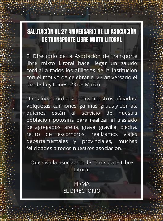 InicioRadio CambalacheSalutación al 27... Salutación al 27 Aniversario de la Asociación de Transporte Libre mixto “Litoral” Por Equipo de Edición 23 marzo, 2026 - 13:24 FacebookWhatsAppX Últimas Noticias Aprehenden a un hombre por instigar a una multitud... Portada Aprehenden a un presunto violador en un recinto electoral de Tupiza durante las elecciones subnacionales Portada Potosí: Bomberos no logran ubicar a minero atrapado en la bocamina Bolívar del Cerro Rico Cuando Hablan Las Urnas Joaquino es el virtual Gobernador de Potosí Cuando Hablan Las Urnas William Cervantes Beltrán promete no fallarle a la población en esta segunda oportunidad Continua leyendo Radio Cambalache¡AVISO IMPORTANTE! Radio CambalacheBanco Unión S.A. comunica a sus clientes y público en general Radio Cambalache¡¡¡¡Vuelve el Rey del Lavado!!!!