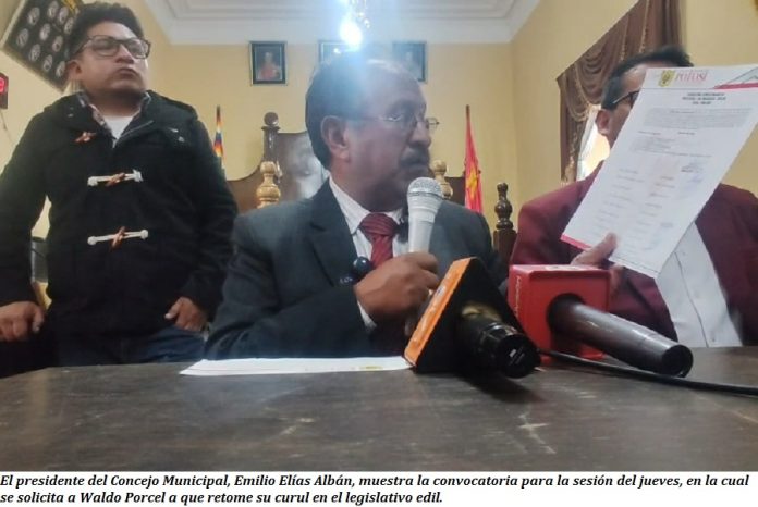 El pleno del Concejo Municipal de Potosí abrogó hoy la resolución 07/2025 del 19 de febrero del año pasado y decidió convocar a Waldo Porcel Soruco para que retome su curul en el hemiciclo en la sesión ordinaria de este jueves 26 de marzo del 2026.
