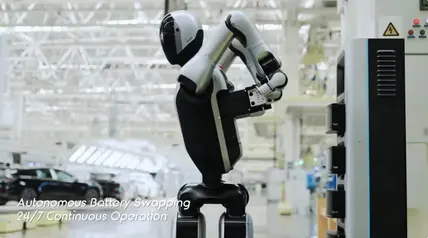 Cuando detecta una batería baja, se dirige por sí mismo a una estación de carga, retira el módulo agotado y coloca uno nuevo utilizando sus propios brazos robóticos.
