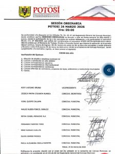 La elección del “alcalde o alcaldesa sustituto (a)” es el primer punto del orden del día de la sesión ordinaria del Concejo Municipal de Potosí prevista para este jueves 26 de marzo, tal como anticipó su presidente, Emilio Elías Albán.