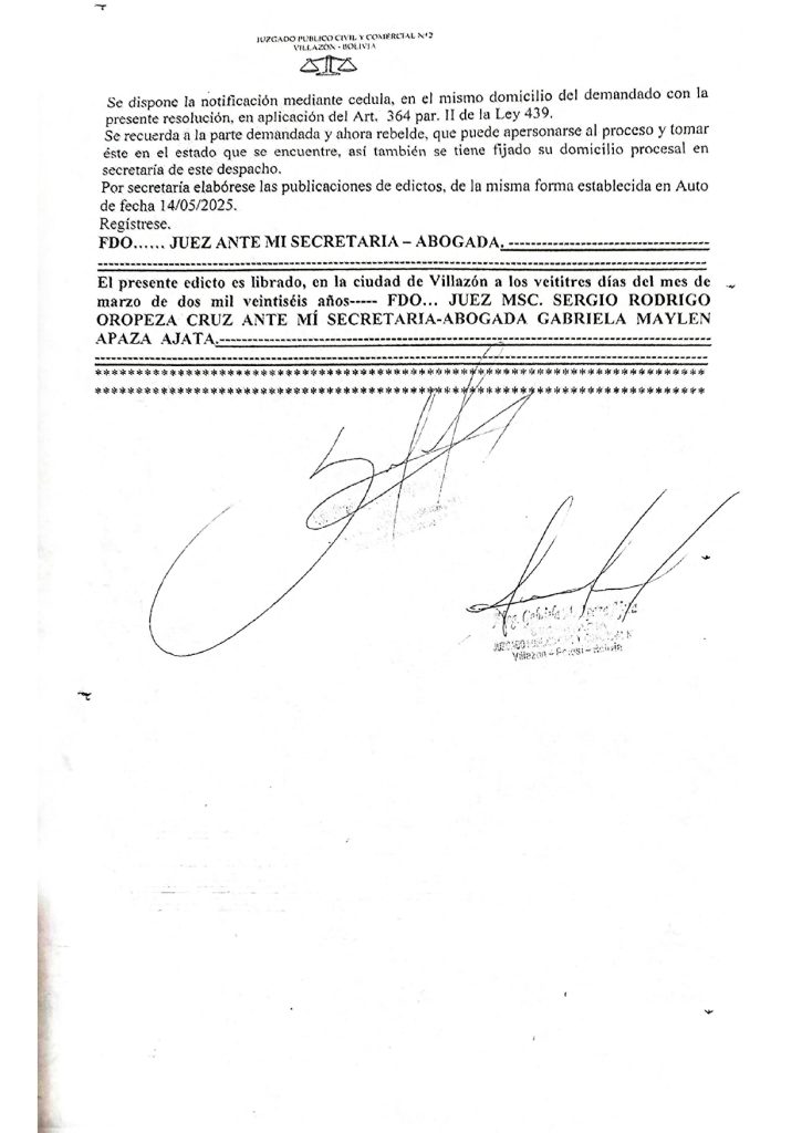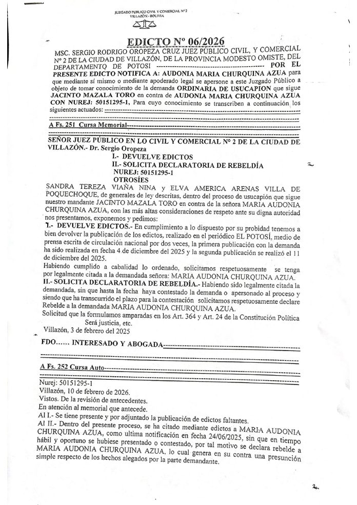 InicioRadio CambalacheEDICTO N° 06/2026 EDICTO N° 06/2026 Por Equipo de Edición 26 marzo, 2026 - 12:16 FacebookWhatsAppX Últimas Noticias ABC Cochabamba aclara: Tramo Río Caine – Toro Toro... Portada Justicia para la Cooperativa Unificada: Tres enviados a prisión tras violento ataque que dejó a un minero al borde de la muerte Portada Concejo Municipal de Potosí anuncia abrogación del interinato de Waldo Porcel y convoca a elección de nuevo Alcalde Sustituto Cuando Hablan Las Urnas AS logró un triunfo contundente en asambleístas por territorio; pero no le alcanza para los dos tercios Cuando Hablan Las Urnas Oficial: AS obtuvo la mitad de asambleístas por población Continua leyendo Radio CambalacheAVISO DE BIEN SOCIAL Radio CambalacheConvocatoria – Unidad Educativa Salvador Revilla “B” Radio Cambalache¡¡¡ Atención Potosí… Con VOLT IQ llega la promo mundialista !!!